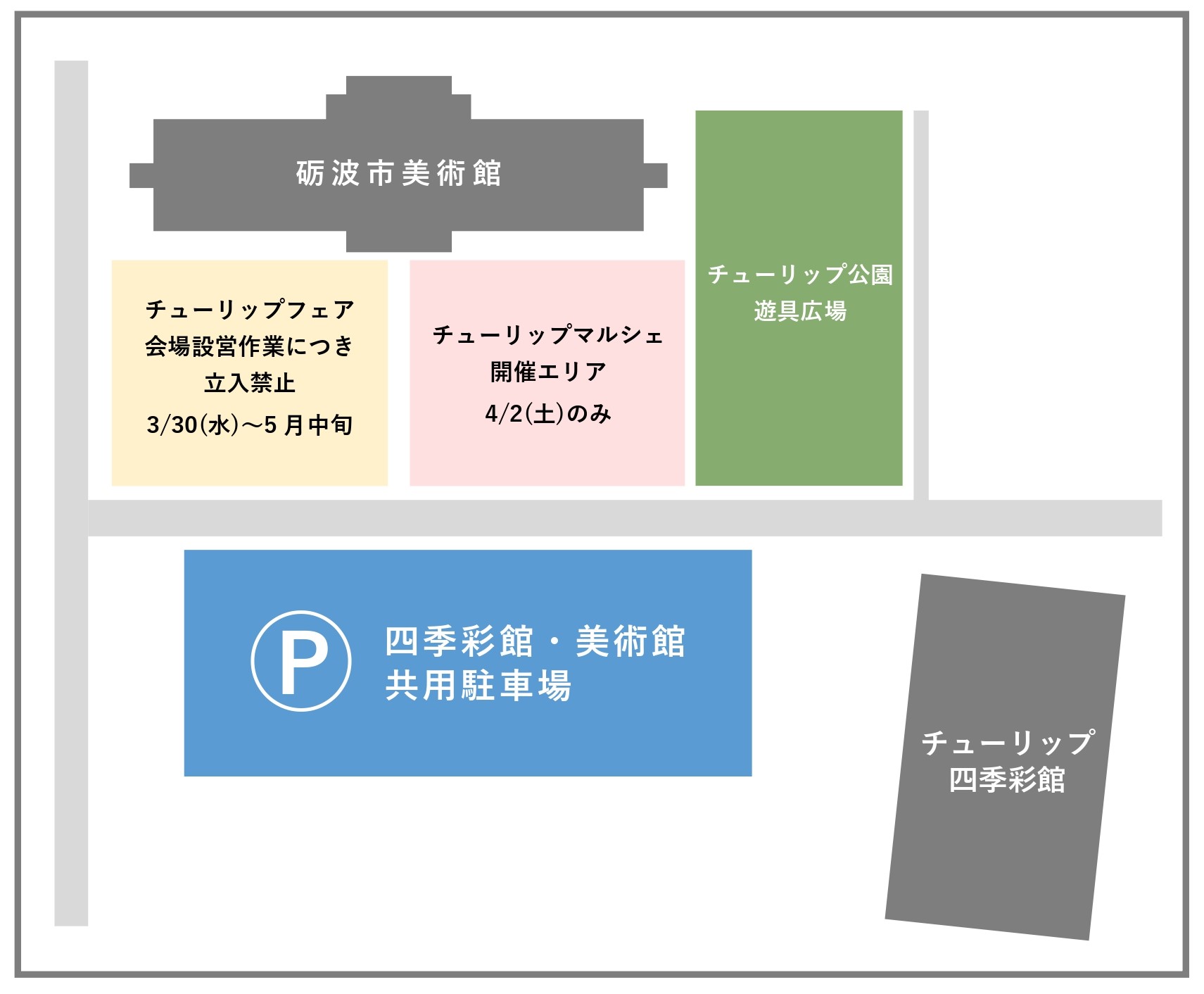 これまでチューリップ公園北門にて開催されていた「チューリップマルシェ」ですが、4/2(土)に限り砺波市美術館の前庭にて開催されます。そのため、4/2(土)は前庭への車両の乗り入れを禁止とさせていただきます。ご来館の際はチューリップ四季彩館前の駐車場(チューリップ四季彩館・砺波市美術館共用駐車場)をご利用ください。(下図参照)