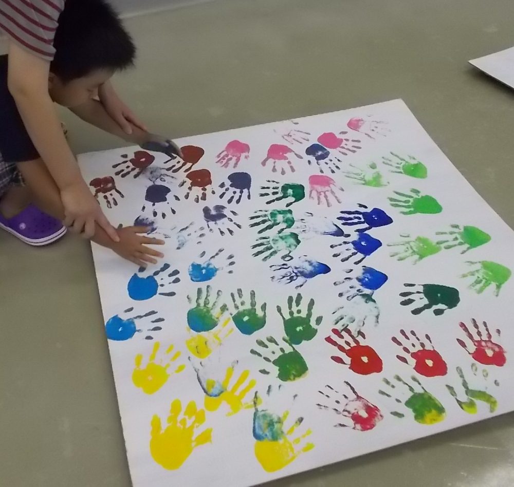 手形をペタペタ!ローラーコロコロ、ブラシでぬりぬり…。