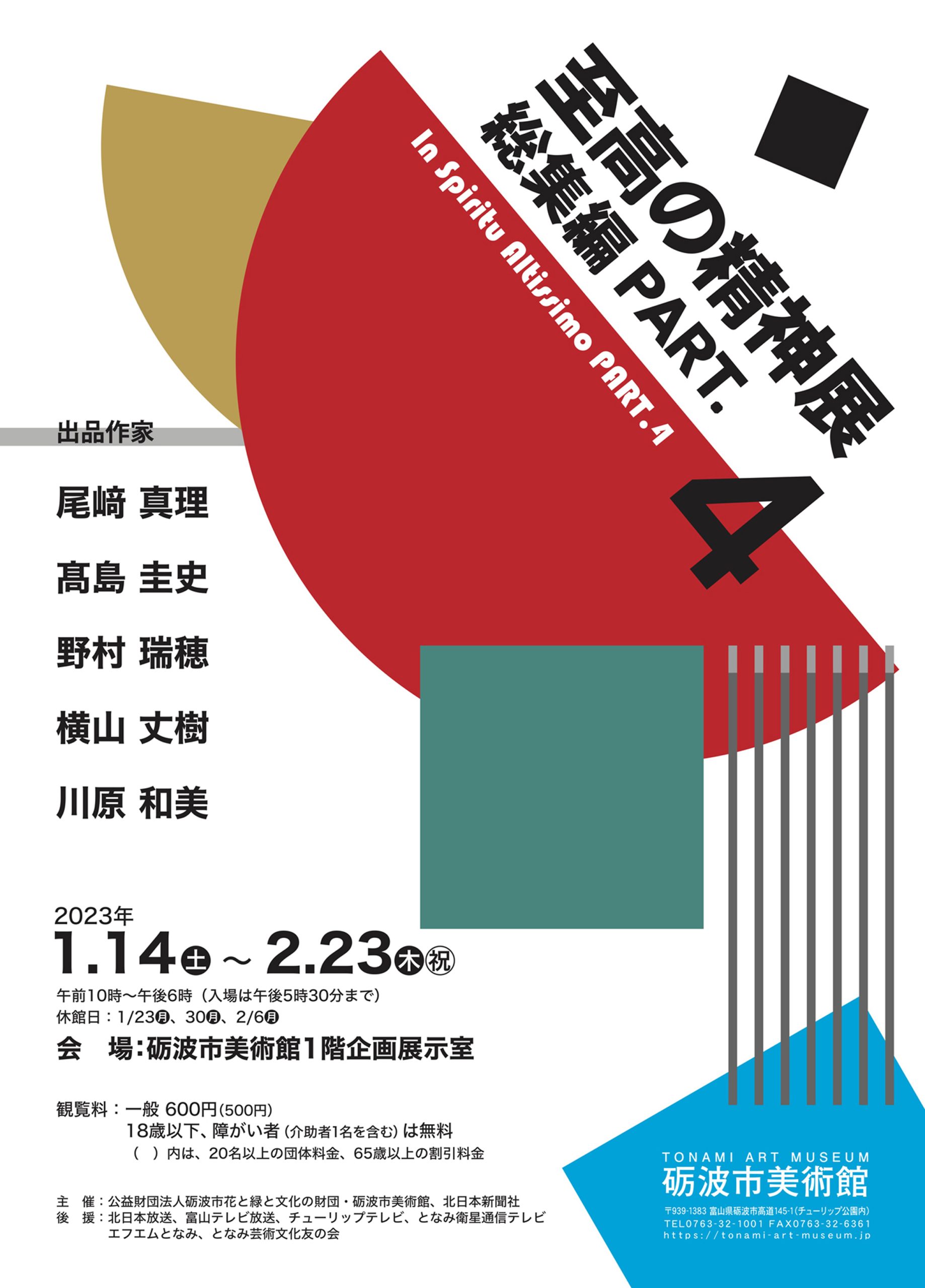■アーティストトーク《要観覧券・申込不要》 第1回:1/22(日) 14:00~ 尾﨑真理・野村瑞穂 第2回:2/5(日) 15:30~ 横山丈樹・川原和美 第3回:2/23(木・祝) 14:00~ 髙島圭史 ※第2回アーティストトークの開始時間が15:30に変更となりました。 ※中止や変更が生じる場合があります。来館の際は、ホームページをご確認いただくか、事前にお電話にてお問い合わせください。
