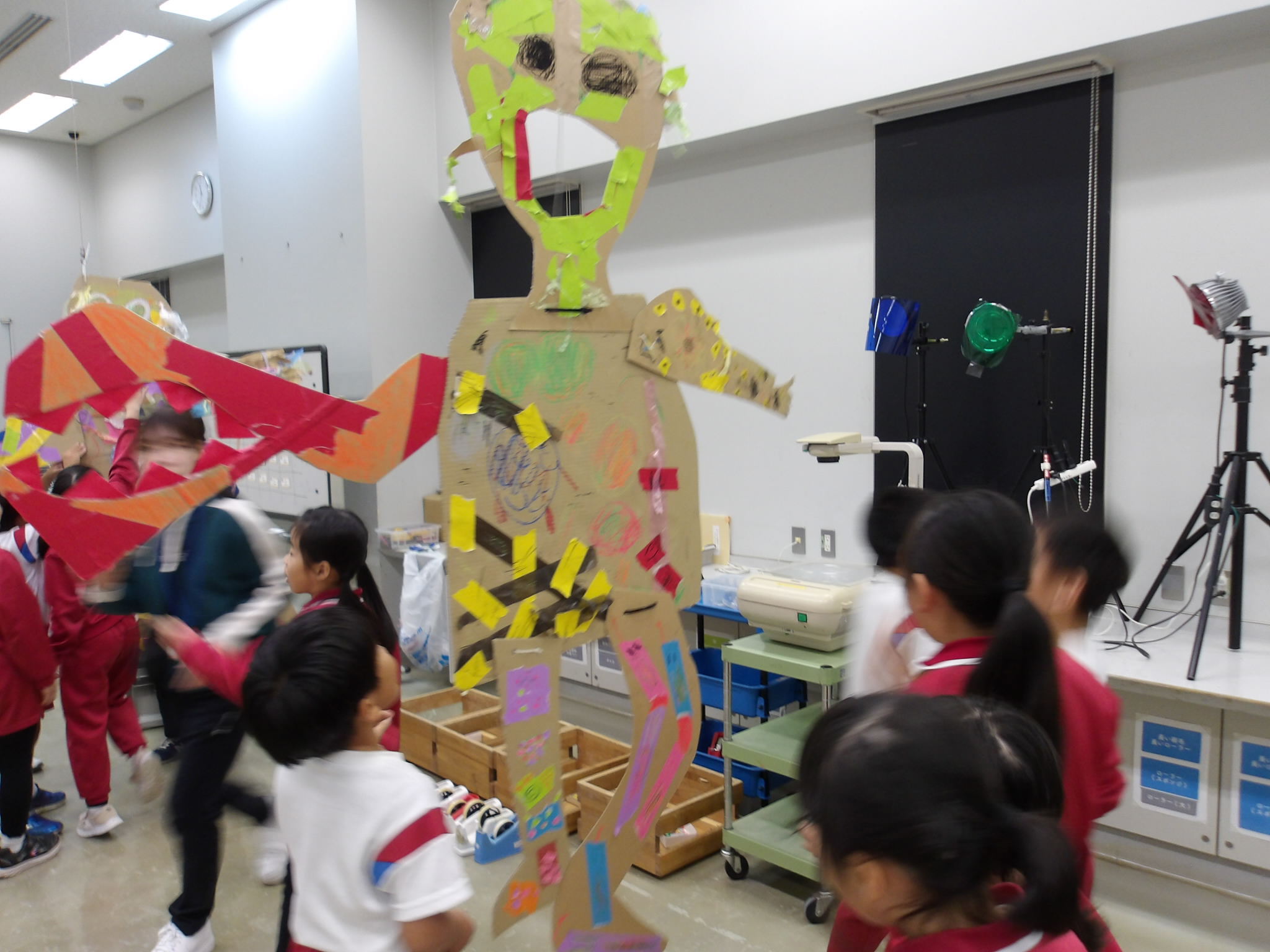 【内容】いろんな形のダンボールにクレヨンなどで色をぬって顔や手足などのパーツを作り、結束バンドでとめてマリオネット風のうちゅう人をつくるよ
