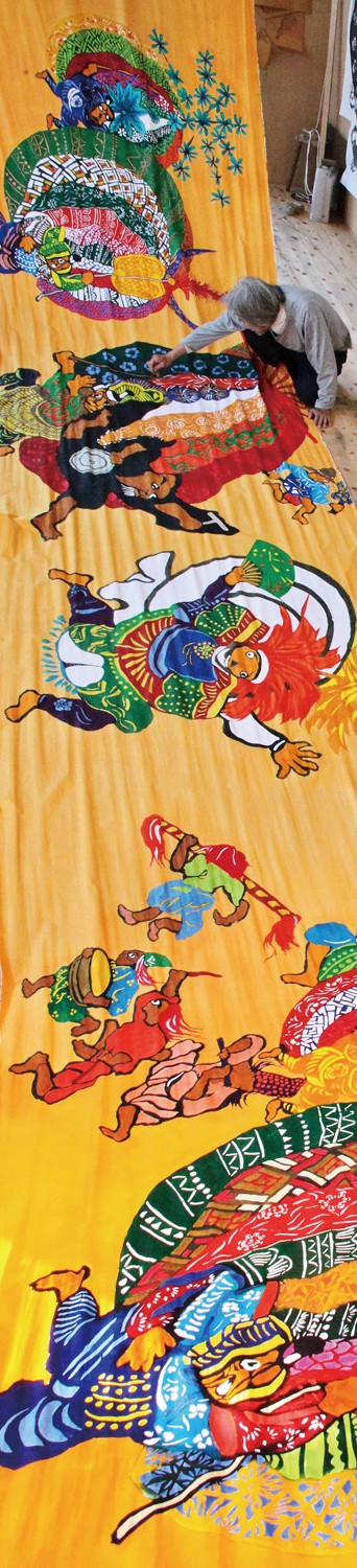 本展では、伝統的な技法である「型絵染」を用いながら、新しい可能性に挑戦し続け、自己表現を貫いたダイナミックな染色作品や『祇園祭』、『花見じゃそうべえ』などの絵本原画を展示し、たじまゆきひこの世界を紹介します。