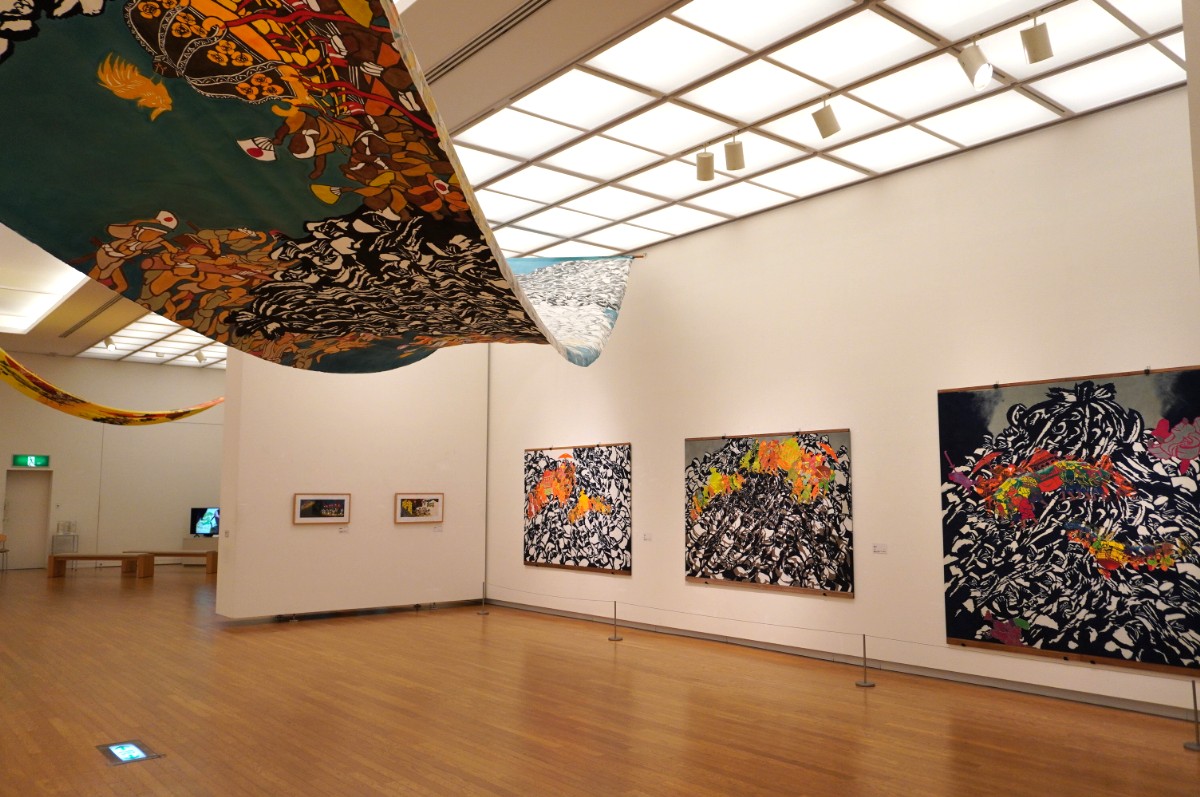本展では、伝統的な「型絵染」を用いながら、シルクスクリーンを使用した作品や、白黒型染のみの作品、10mを超える大型作品など、新しい可能性に挑戦し続け、自己表現を貫いたダイナミックな染色作品や、数年をかけて取材を行った『祇園祭』(童心社)、淡路島を舞台とした『ふしぎなともだち』(くもん出版)、人気シリーズの最新作『花見じゃそうべえ』(童心社)などの人々のパワーあふれる物語から社会や人間の本質に迫る物語の多岐にわたる絵本原画を展示し、たじまゆきひこの世界を紹介します。