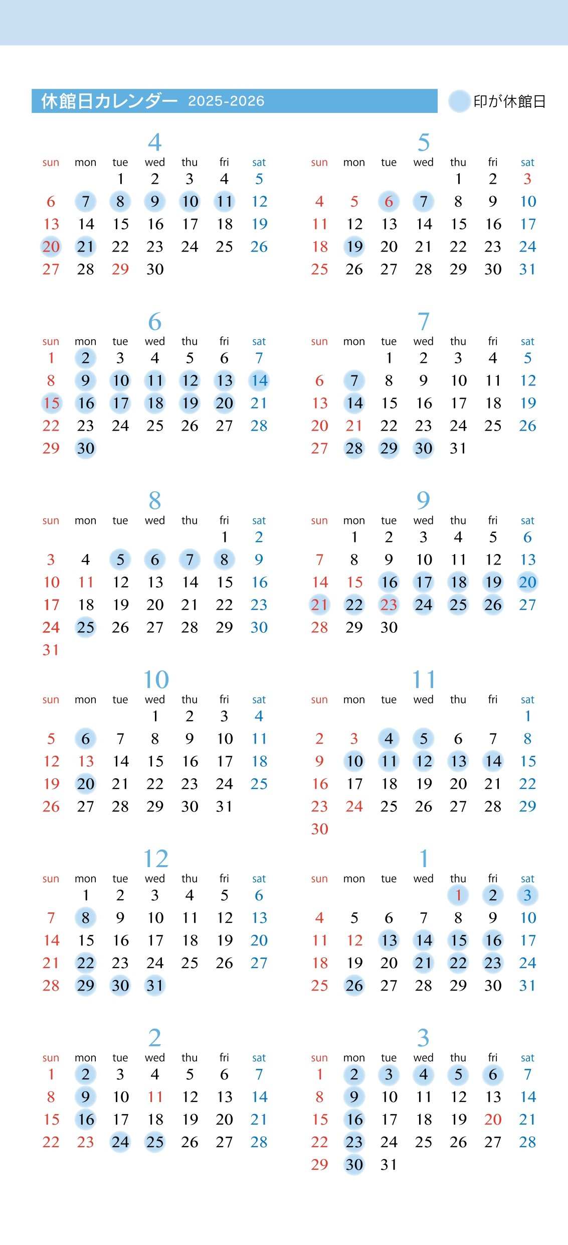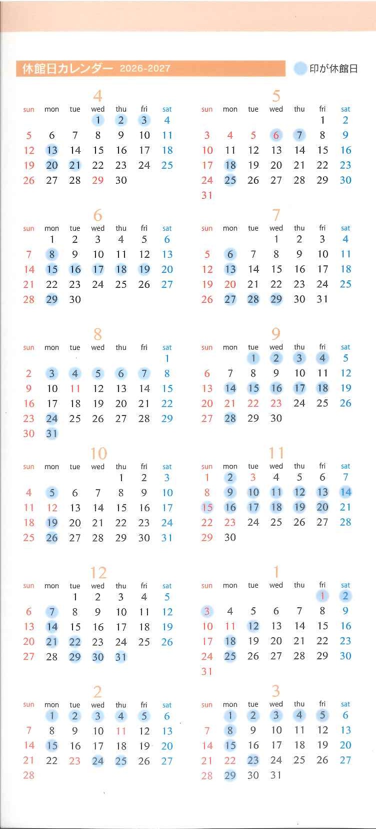| 休館日 | ・年末年始(12/29~1/3) ・施設点検や展示入替等による休館 詳しくは【休館日カレンダー(jpg)】をご確認ください |